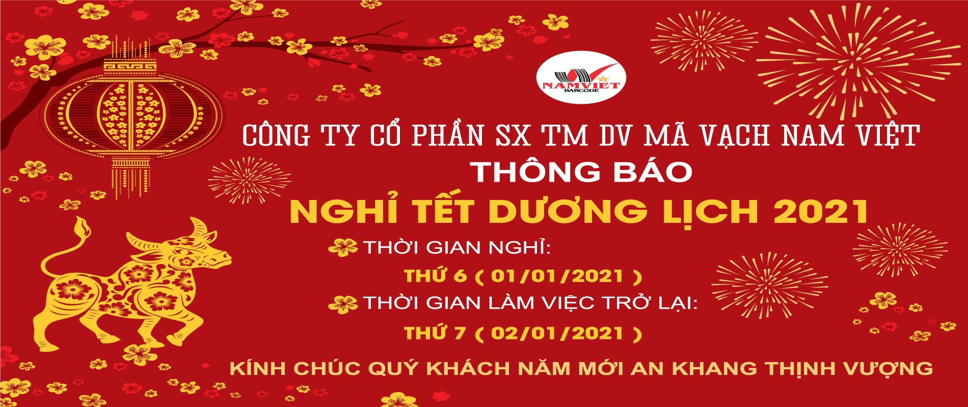 CÔNG TY CP SX TM DV MÃ VẠCH NAM VIỆT Chân thành cảm ơn sự hợp tác của Quý khách hàng, đối tác trong thời gian vừa qua. Nay, Công ty trân trọng thông báo đến Quý khách hàng, đối tác thời gian nghỉ tết Dương lịch 2021 như sau: Toàn thể Nhân viên Công Ty CP SX TM DV Mã Vạch Nam Việt nghỉ...