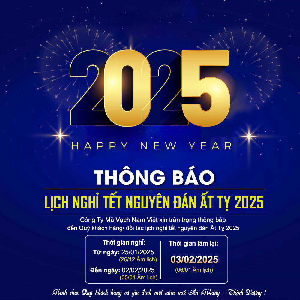 Công ty CP SX TM DV Mã Vạch Nam Việt xin trân trọng thông báo đến Quý khách hàng, đối tác Lịch nghỉ Tết Nguyên Đán 2025: Lịch nghỉ Tết Nguyên Đán Ất Tỵ 2025: Thời gian nghỉ : Nghỉ từ ngày 25/01/2025 đến hết ngày 02/02/2025. (nhằm ngày 26 tháng chạp đến hết ngày mùng 05 tháng giêng năm Ất Tỵ)....