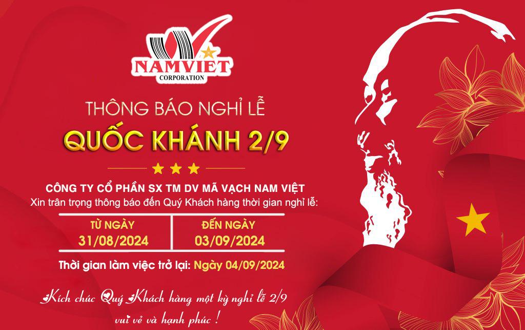 CÔNG TY CỔ PHẦN SX TM DV MÃ VẠCH NAM VIỆT xin trân trọng thông báo đến Quý khách hàng thời gian nghỉ Lễ Quốc Khánh 2/9 như sau: Thời gian nghỉ lễ: Từ thứ bảy ngày 31/08/2024 đến hết thứ 3 ngày 03/09/2024 Thời gian làm việc trở lại: Thứ 4 ngày 04/09/2024 MÃ VẠCH NAM VIỆT Kính chúc Quý Khách hàng cùng gia...
