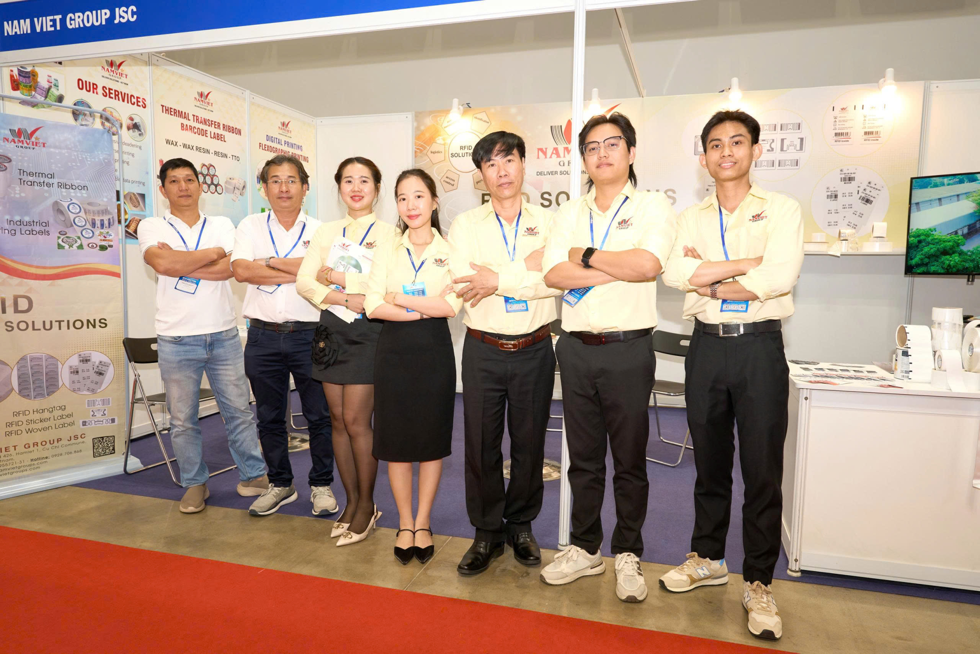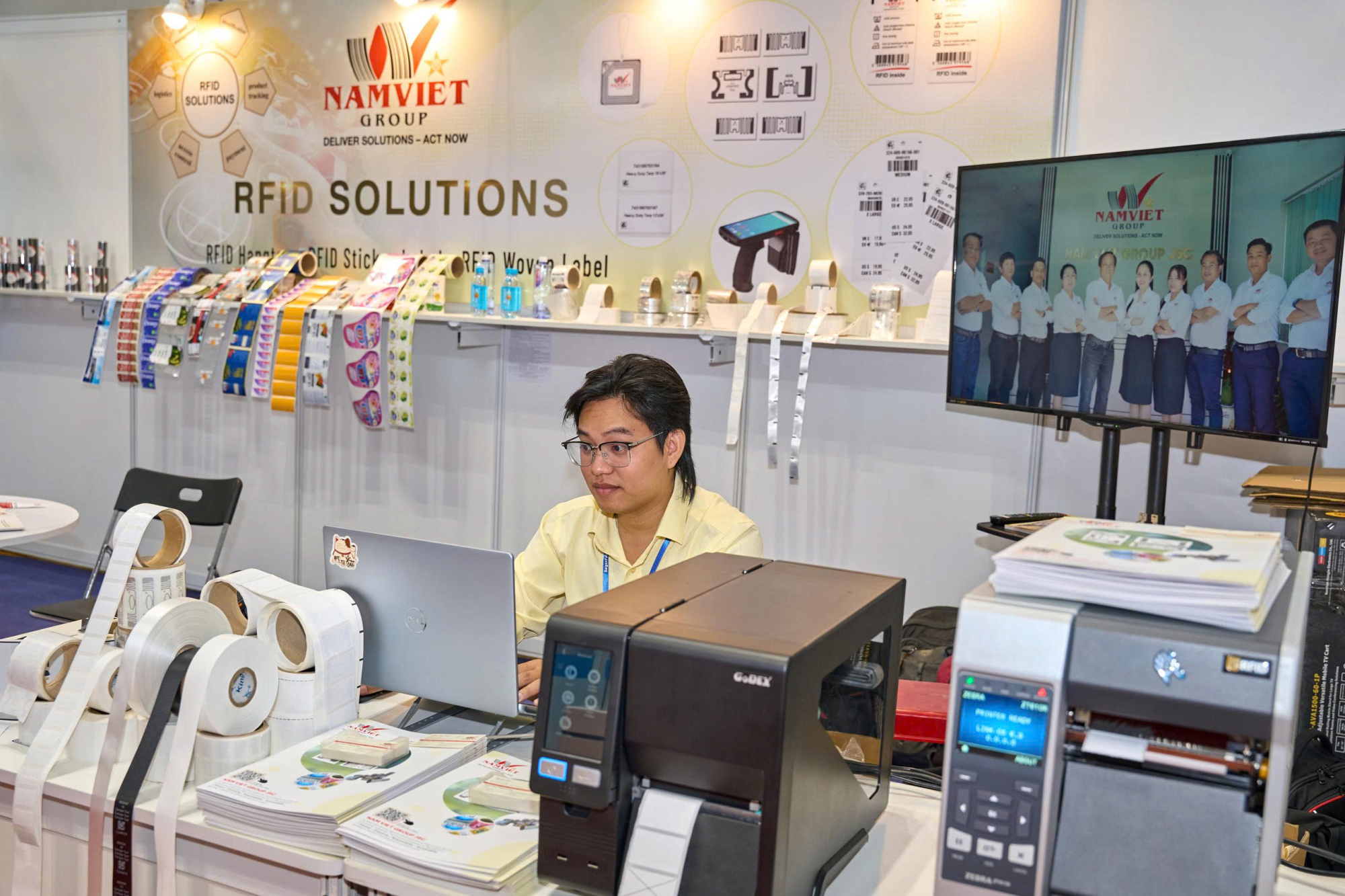 Tại triển lãm, Nam Việt Group đã trưng bày ba nhóm sản phẩm và giải pháp chủ lực. Đầu tiên là RFID Labels – giải pháp nhãn thông minh ứng dụng công nghệ nhận diện bằng tần số vô tuyến. Đây được xem là xu hướng tất yếu trong quản lý hàng hóa, kho vận và bán lẻ, giúp doanh nghiệp tối ưu hóa quy trình, giảm thiểu sai sót và nâng cao hiệu suất vận hành. Khách tham quan có cơ hội trải nghiệm trực tiếp cách thức hoạt động của RFID thông qua các mô hình thực tế được trình diễn tại gian hàng.