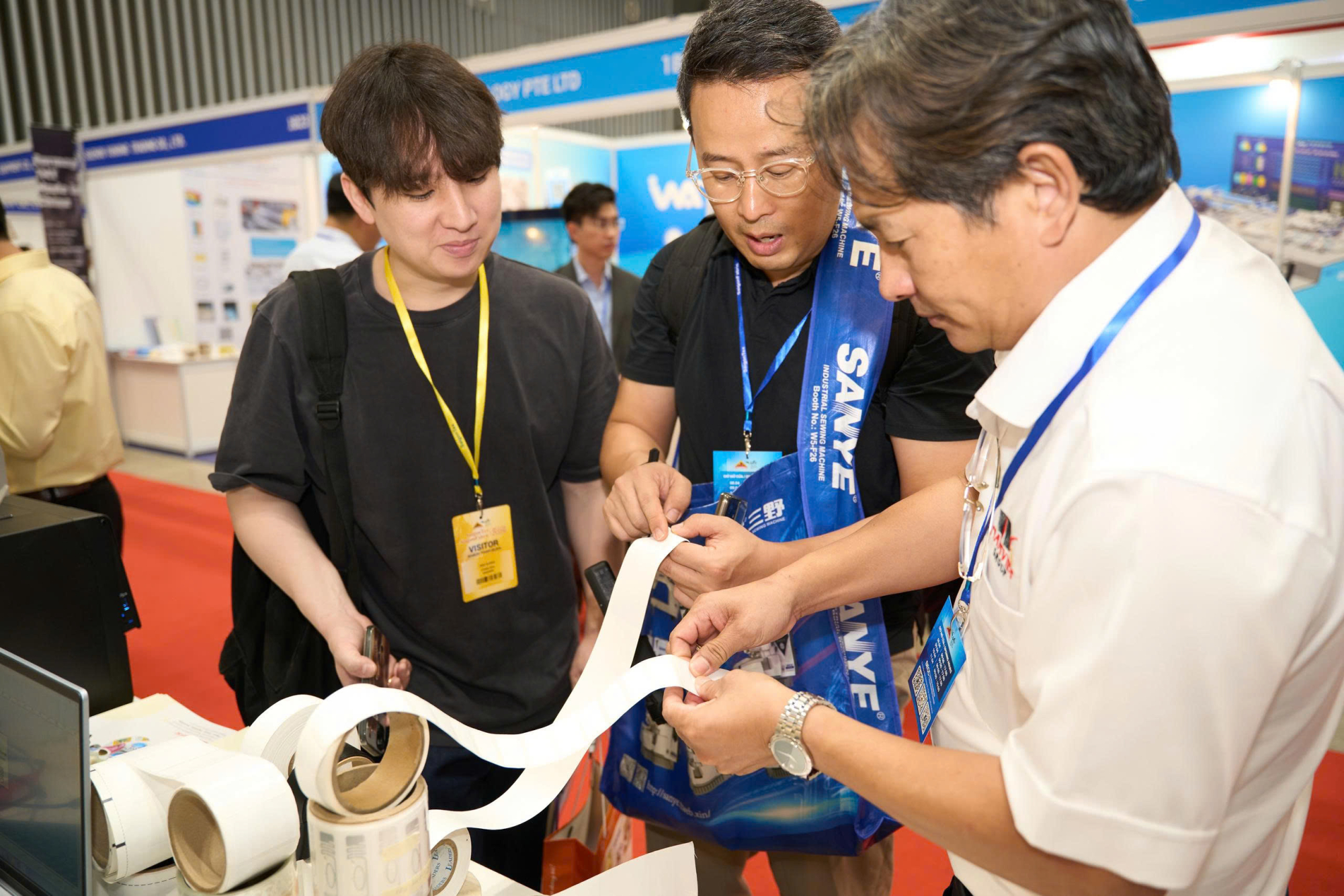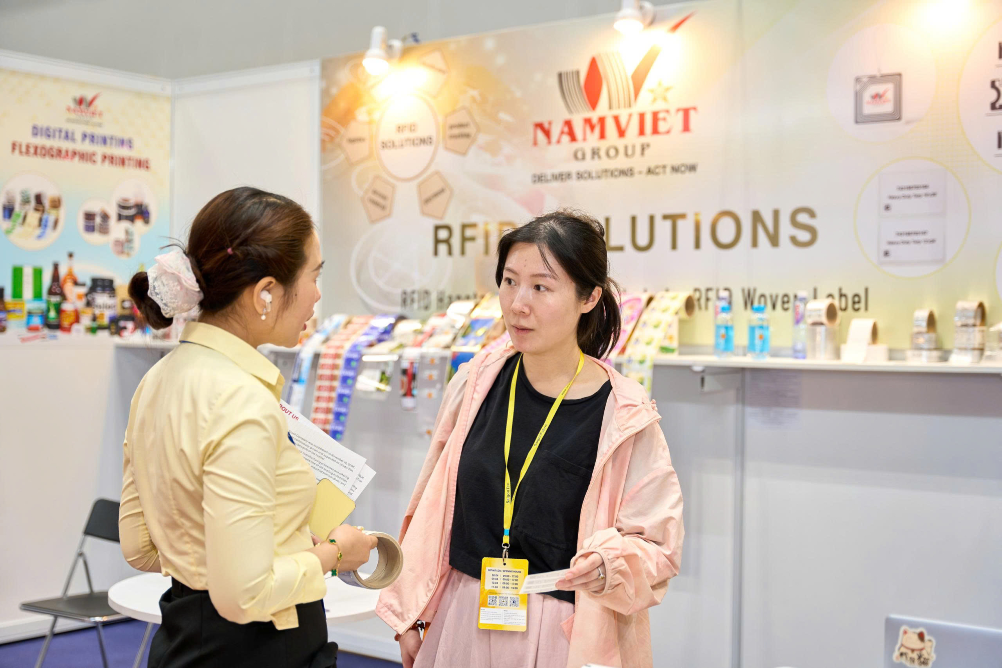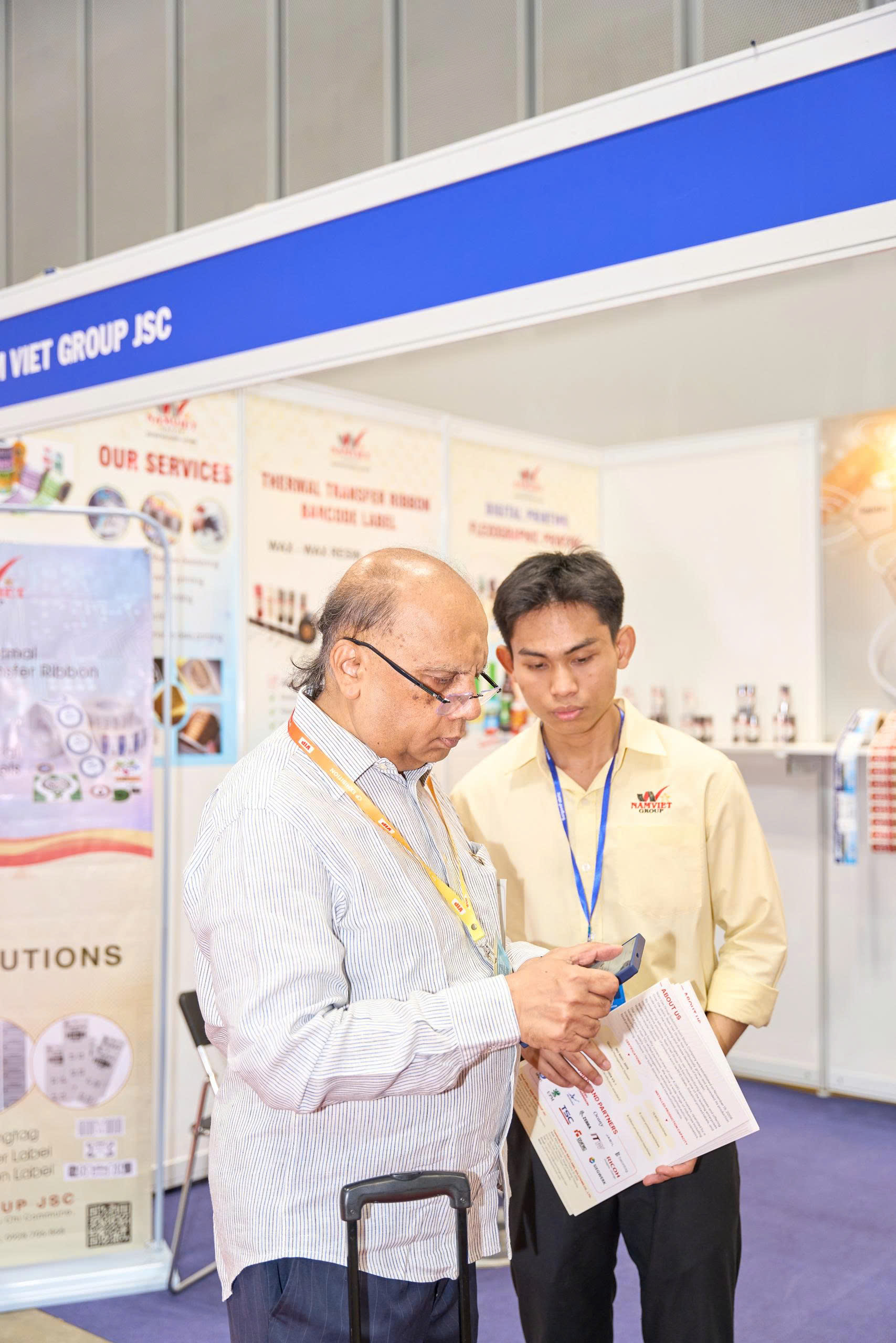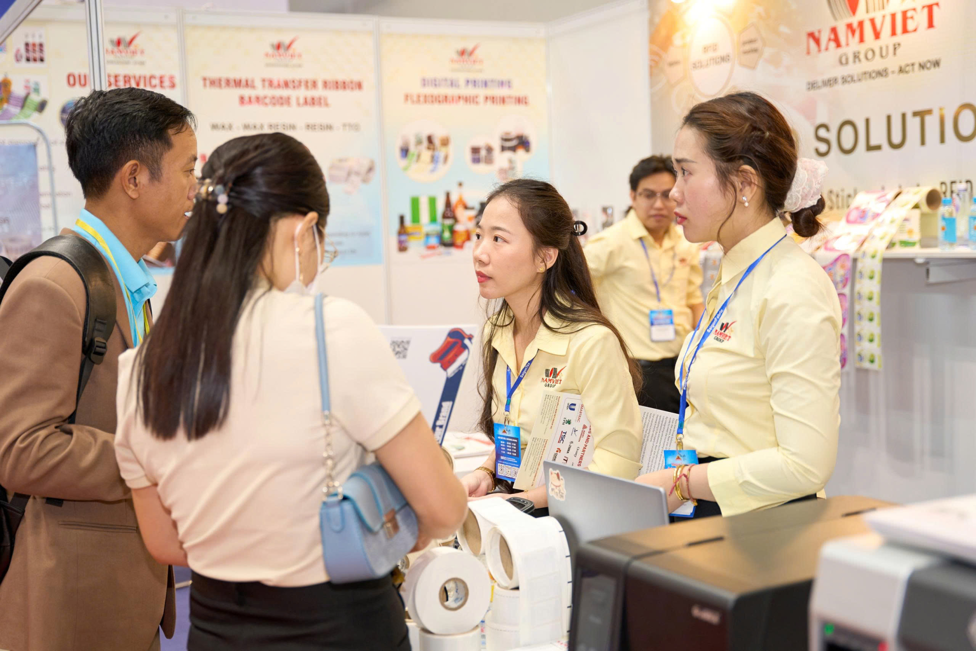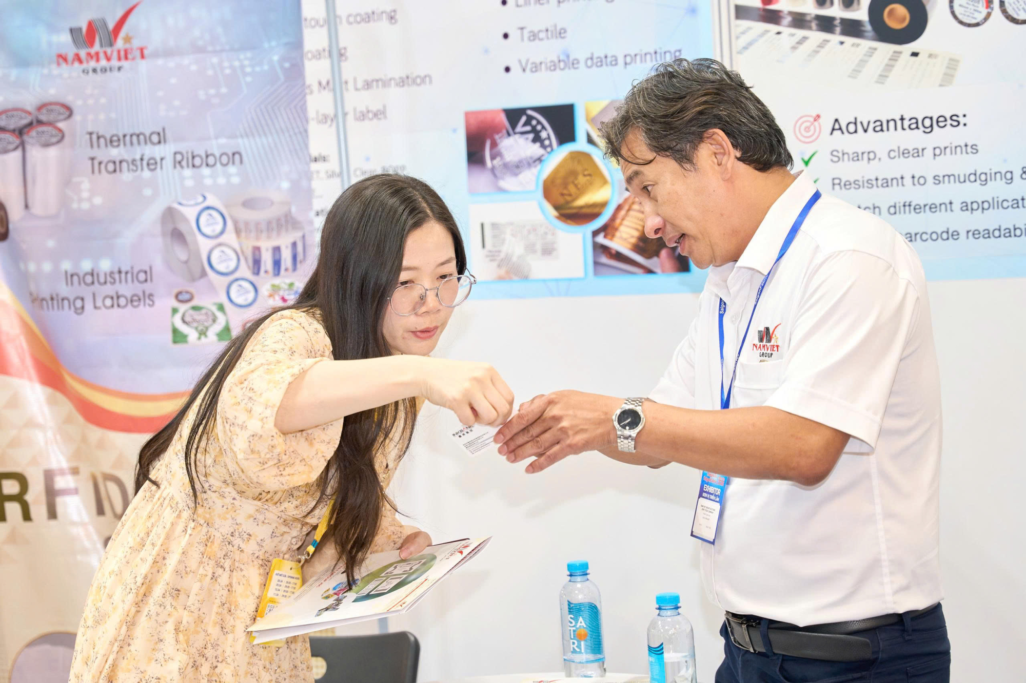 Bên cạnh đó, giải pháp Labels Printing cũng nhận được nhiều sự quan tâm. Với khả năng đáp ứng đa dạng nhu cầu in ấn nhãn mác cho nhiều lĩnh vực khác nhau như may mặc, logistics, thực phẩm và dược phẩm, Nam Việt Group đã chứng minh năng lực cung cấp các giải pháp in ấn linh hoạt, chất lượng cao và phù hợp với từng yêu cầu cụ thể của khách hàng. Các mẫu nhãn được trưng bày tại gian hàng cho thấy sự đa dạng về chất liệu, thiết kế cũng như độ bền, đáp ứng tốt các tiêu chuẩn khắt khe của thị trường.